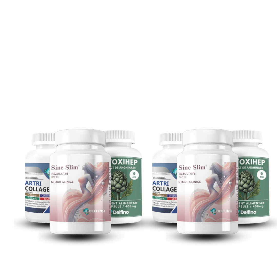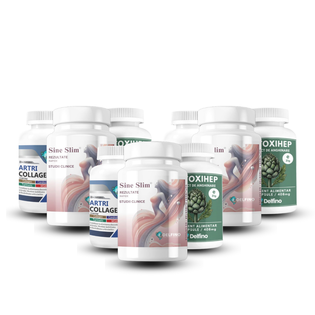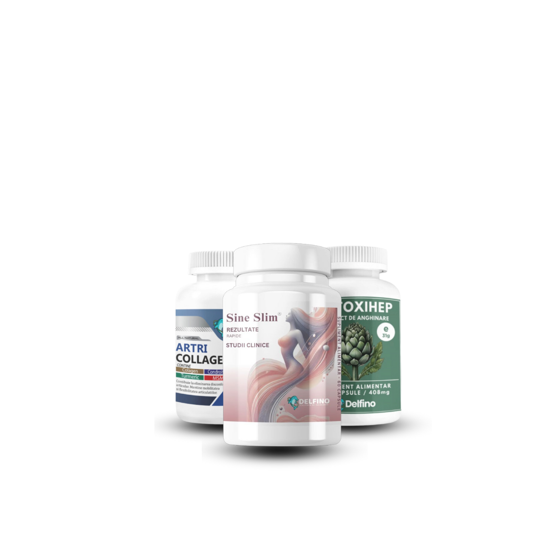 Este un sistem complet de transformare corporală format din 3 produse sinergice: EnergoSlim pentru energie și metabolism activ, Sine Slim cu Sinetrol® pentru arderea grăsimilor, și DetoxiHep pentru eliminarea toxinelor și îmbunătățirea digestiei.