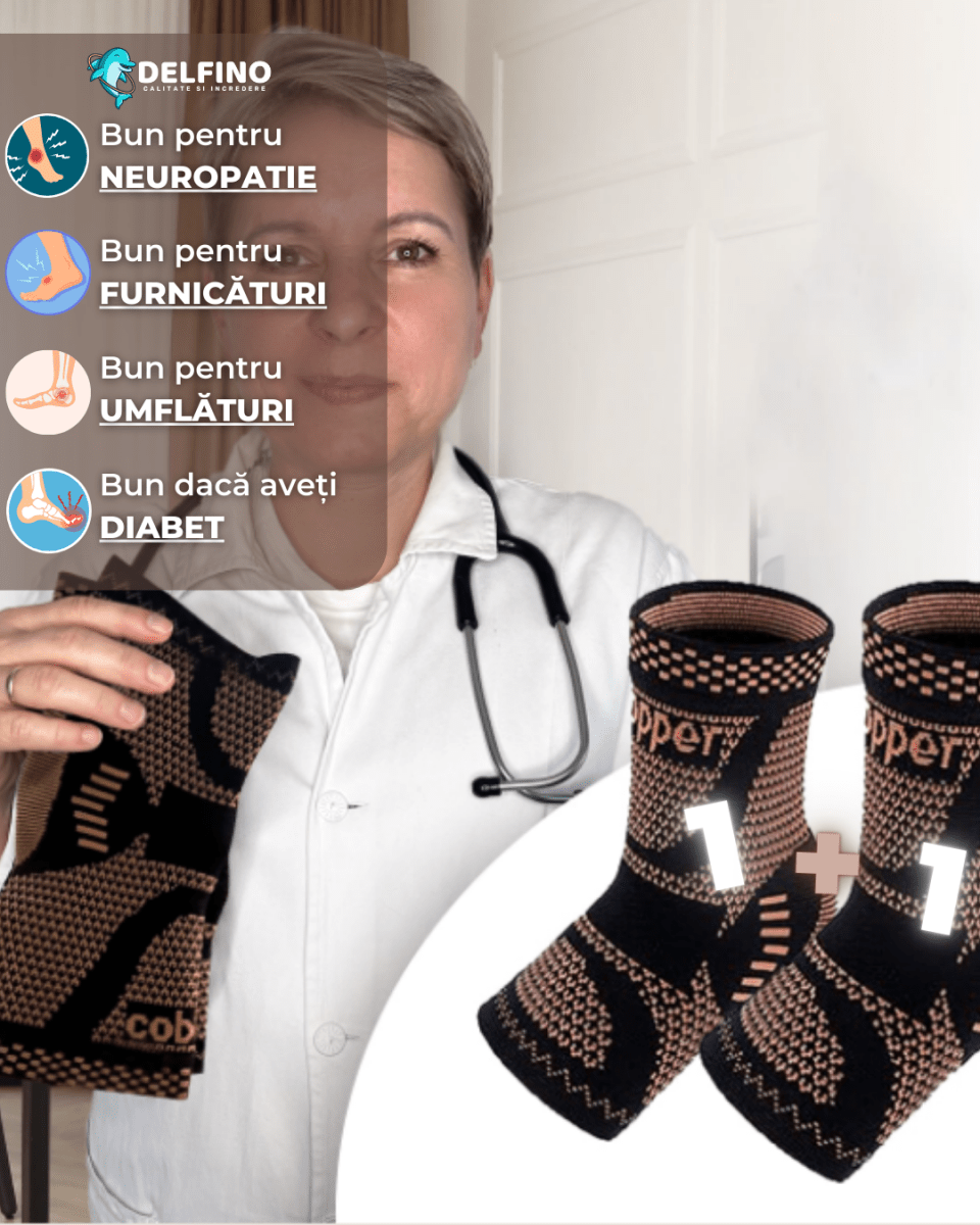 Delfino conține fir de cupru medical cu eliberare controlată de ioni, nu simple șosete elastice. Tratează cauza, nu doar simptomele.